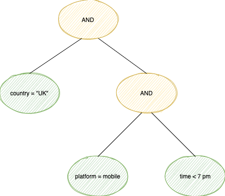 The leaf nodes represent individual filter conditions, like “country = UK”. Non-leaf nodes represent an operation performed on their subtrees. An AND node says “only match data that conforms to the conditions in my left subtree and in my right subtree”. An OR node would be similar, but matching either the left or right subtree without requiring both subtrees to match at the same time.