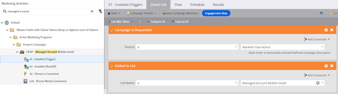 Create a Heap segment of users who have done the lead-qualifying action within your product. Any firmographic restrictions you want to add can also be included in the segment definition via data from CRM integrations (or added later in your marketing automation tool). Our qualification criteria for a user to become a “Mobile Install - Managed Account” ePQL are: