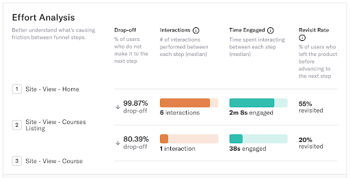 With Effort, we can replace that rule of thumb with real data. What if that early step actually has low conversion because of a core usability issue? What if users are stumbling on a late step not because of friction in your product but because they were never properly qualified in the first place?