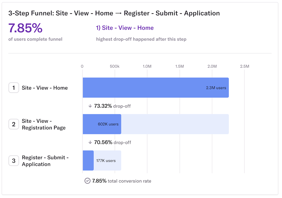 For difficult steps like completing a registration, we will cover in a future blog post how “Step Suggestions” can automatically “zoom in” to those parts of the flow where the most users are dropping off, in order to specifically target reductions in friction.